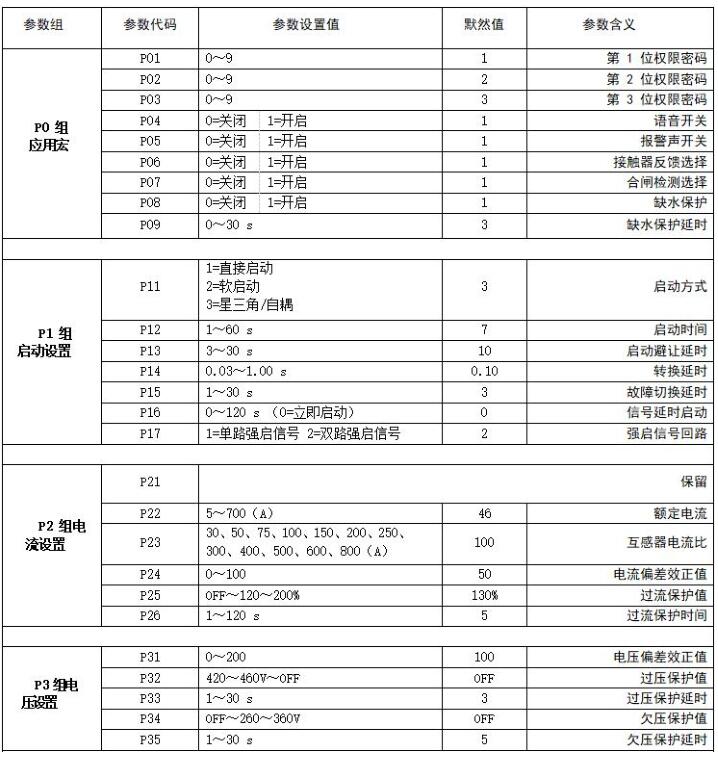 設(shè)置OFF 代表關(guān)閉過流保護功能,系統(tǒng)只報警不保護不切換!當(dāng)設(shè)置了保護值系統(tǒng)是根據(jù)額定電流的值來計算保護值,公式:P22值 *P25 值 = 保護動作值